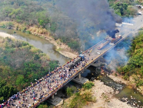 De jeunes Colombiens semblent avoir été à l’origine de l’incendie du camion sur le pont Santander, dont les images ont fait le tour du monde. Contrairement à la version qui accusait les autorités de la police aux frontières, des images montrent un jet de cocktail molotov sur le camion. La télévision locale a également pu filmer la préparation de ces projectiles in situ. De son côté, le gouvernement vénézuélien a fourni des images qui contredisent la version d’un camion contenant de « l’aide humanitaire », et a révélé, au milieu des restes fumants, des kits servant à des tactiques de blocage de rues.