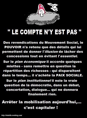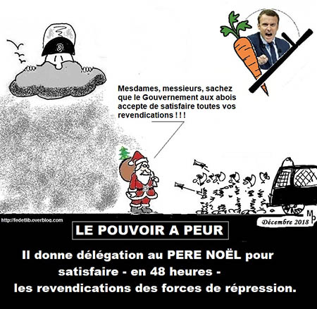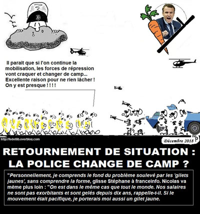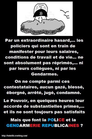 On est 6 manifestants, ils sont une bonne dizaine a nous contrôler, intimidations, menaces, humiliations, on doit baisser les yeux, toutes nos affaires sont jetées par terre et ils en éparpillent certaines, on est jetés contre le mur, fouille violente (on te pince), et tu es prié de dégager avant qu’ils ne passe à la vitesse supérieure. Toute tentative de discussion ne fait qu’aggraver ton cas, alors tu la fermes. Et pour finir, un dernier me pousse dans le dos et je me ratatine la gueule contre le sol.