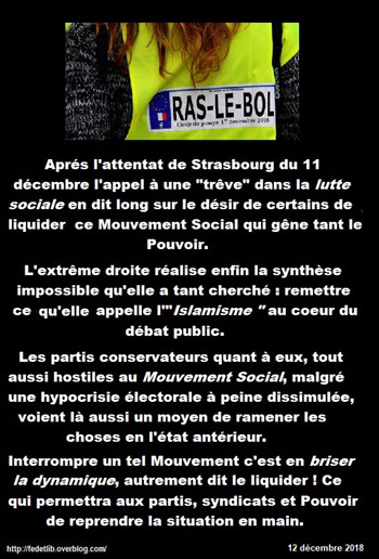 Malgré le terrorisme commandité par l’État à Strasbourg, et malgré les menaces d’une répression terrible, les gilets jaunes iront manifester quand même samedi 15 décembre 2018 et ne demanderont aucune autorisation :
