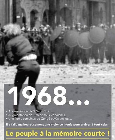 (…) Le point commun entre Mai 68 et les Gilets Jaunes, c’est l’aspect « bouillonnant » du mouvement, qui part effectivement un peu dans toutes les directions à la fois. Mai 68 a aussi cette image d’un mouvement "fourre-tout", et s’il l’a encore, c’est bien qu’il l’avait dès le départ, en fait, au point que certains, aujourd’hui kollaborateurs zélés du système, et particulièrement, du macronisme, avaient, à l’époque, cru bon de formuler ce phénomène par le slogan : "Ce que nous voulons, Tout !"