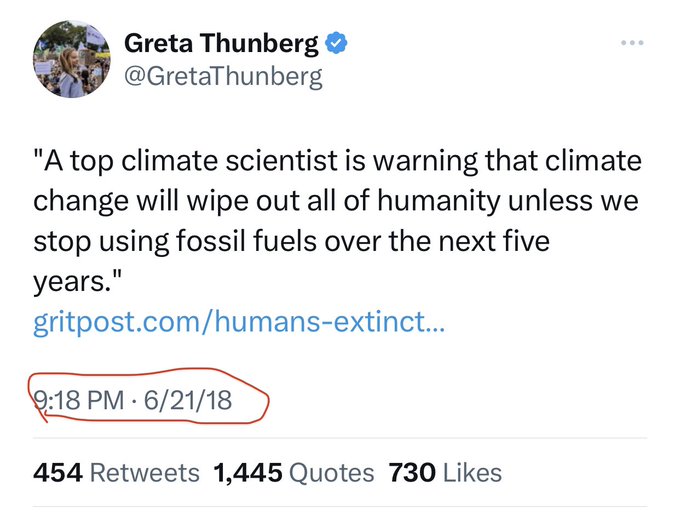 Le 21 juin 2018, la militante climatique suédoise, alors âgé de 15 ans, a envoyé un tweet alarmant qui semblait impliquer qu’en raison du changement climatique causé par les combustibles fossiles, il ne nous restait que cinq ans avant la fin du monde.