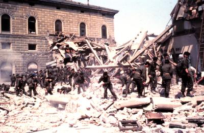 Les secouristes se dirigent vers la gare de Bologne après l’explosion qui a suivi l’attentat, dans laquelle l’implication du P2 a été constatée.