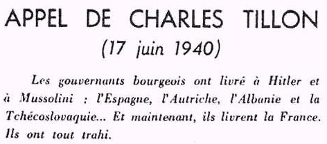 Note de do : en dessous de l’article de Berthe, je place l’appel à la résistance que Charles Tillon du PCF, fondateur des FTP, a lancé le 17 juin 1940. Et pour bien montrer qu’il ne s’agit pas d’une exception, je mets aussi l’appel du 10 juillet 1940 du PCF signé par MAURICE THOREZ, Secrétaire Général du PCF et JACQUES DUCLOS, Secrétaire. Je parle aussi de la grève des mineurs du Nord-Pas-de-Calais qui a eu lieu du 27 mai au 9 juin 1941, soit avant l’invasion de l’URSS par l’Allemagne le 22 juin 1941.