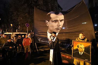 Un prêtre prononce un discours lors d’une procession aux flambeaux en l’honneur du collaborateur nazi Stepan Bandera dans la capitale ukrainienne Kiev le 1er janvier 2022. Le mouvement nationaliste de Bandera a directement aidé les forces d’occupation allemandes à perpétrer l’Holocauste pendant la Seconde Guerre mondiale. Pavlo Bagmut Ukrinform