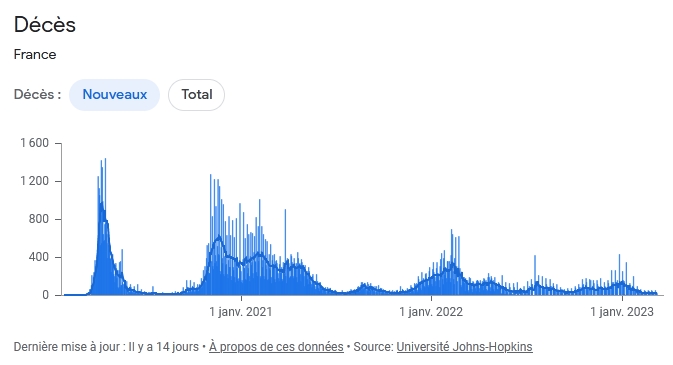 Habituellement quand je voulais avoir facilement des courbes sur le coronavirus, je tapais dans Google les mots clefs "Covid France Statistique" et j’obtenais immédiatement les courbes à jour. Mais aujourd’hui, ça n’a pas marché. Après recherches sur internet, j’ai trouvé un lien qui donne le même genre de courbes. Celle qui nous intéresse est la dernière :