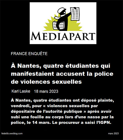 Nathalie Appéré (PS), maire de Rennes, femme peu portée sur le sécuritaire, a été contrainte de se mouiller vu l’importance des dégâts : « Notre ville est ce soir le théâtre de violences urbaines sidérantes (…) J’adresse tout mon soutien aux forces de l’ordre qui tentent de contenir les groupes de casseurs, organisés et déterminés, qui commettent de nombreuses dégradations sur les commerces, les entreprises et les bâtiments publics (..) J’ai alerté les autorités, jusqu’au sommet de l’Etat, depuis plusieurs jours, pour exiger que notre ville soit protégée. J’ai appuyé les demandes de renforts policiers formulées par le Préfet. Notre ville ne peut être abandonnée à la violence des casseurs » (Ouest-France, Rennes, vendredi 17 mars 2023).