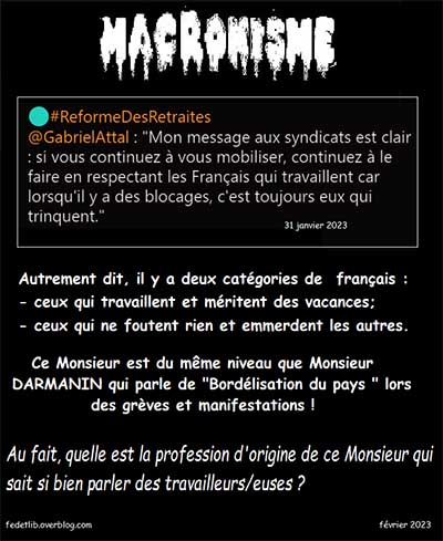 Ne soyez pas aveugle, la retraite est un leurre, le gouvernement et le président sont des escrocs qui ruine la France et torture les français…. Il est temps de prendre conscience avant qu’ils ne déclenchent la guerre avec la Russie. Les peuples doivent réagir aux véritables dangers qui les menacent. Ne faites pas confiances aux institutions ni aux syndicats, ce qui doit-être en jeux c’est le départ de macron et de la clique qui l’entoure. Le peuple doit s’organiser pour être solidaire et se rassembler, toute la population doit se mobiliser.