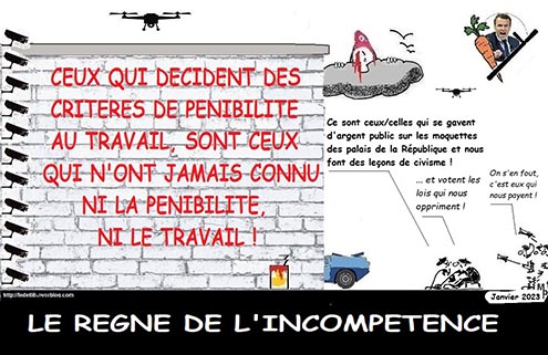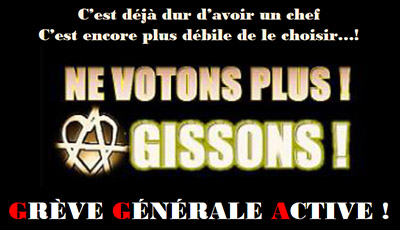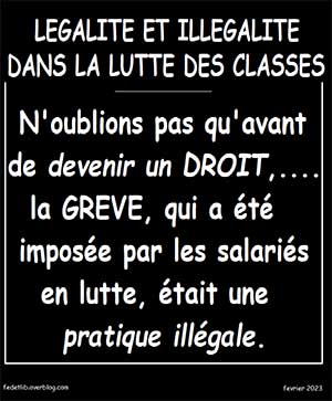 Les seules grèves qui font peur au pouvoir, les seules auxquelles il cède, ce sont les grèves sauvages, celles qui sont incontrôlables, celles qui ne sont donc pas contrôlées par les syndicats. Aussi, quand vous voyez à la télévision des grèves, même si elles durent longtemps, et des manifs, même si le nombre de manifestants est énorme, qui sont décorées de nombreux drapeaux et autres insignes de la CGT, de la CFDT et de FO ; alors, vous pouvez deviner que le pouvoir n’a pas peur et ne cèdera pas, car tous ces drapeaux et insignes syndicaux sont la preuve que le mouvement est bien contrôlé par les syndicats, et que par conséquent tout va bien pour le pouvoir. Et plus les banderolles, insignes et drapeaux syndicaux sont nombreux, et plus le mouvement est sous contrôle ; parfois, on remarque à peine les manifestants tellement on ne voit que les insignes syndicaux !