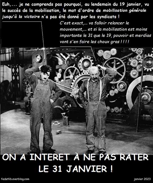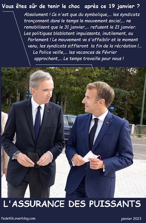 Du 19 janvier 2023 au 31 janvier 2023 ? les syndicats jouent au saute-mouton pour casser les reins des salariés. Leur seul but est de parvenir à contrôler le mouvement afin de mériter les subsides de l’État et du patronat.