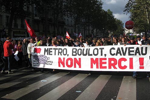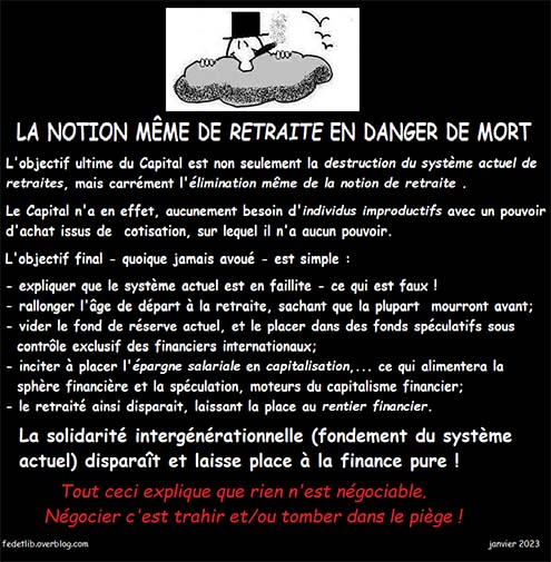 En un sens, lancer ce "défi" de la "réforme des retraites" est aussi un moyen comme un autre, pour le système, d’éloigner l’attention des problèmes de survie immédiate, générés par l’accentuation de la crise, et qui pourraient réellement unir la masse des plus pauvres, et, fondamentalement, des plus révoltés, mais qui n’ont pas les moyens d’expression de leurs revendications générales, qui dépassent potentiellement, pourtant, les clivages sectoriels et corporatistes du syndicalisme français actuel.