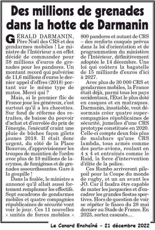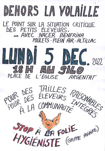 Entendu à France-Info le vendredi 2 décembre 2022 : sous prétexte de grippe aviaire, le pouvoir a déjà assassiné un million de volailles et s’apprête à continuer. Mais, L214 ne fait rien. L214 trouve ça tout à fait normal !