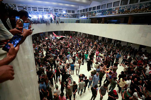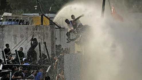 La police utilise un canon à eau pour empêcher les partisans du Cadre de coordination d’entrer dans la zone verte de Bagdad le 1er août 2022, lors d’une contre-manifestation contre les loyalistes de Moqtada Sadr.