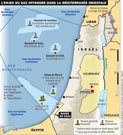 Le polygone bleu pâle partant de Gaza est dénommé : « Licence accordée à British Gas pour l’exploitation du champ de Gaza offshore ». Rien à voir avec des eaux territoriales .