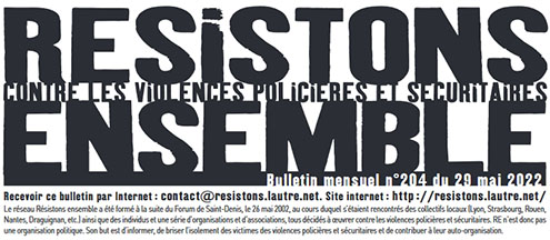 Voici en PDF, le n° 204, du 29 mai 2022, du petit journal mobile recto-verso A4 "RESISTONS ENSEMBLE" du réseau contre les violences policières et sécuritaires.