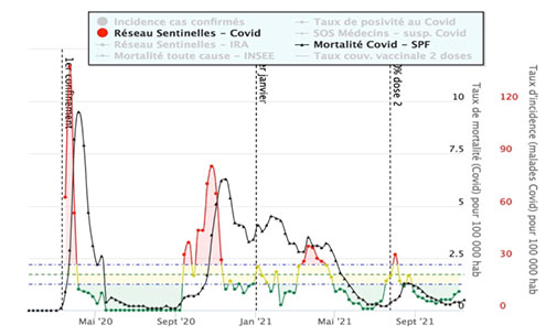 Fig. 1 : Évolution du taux d’incidence hebdomadaire pour 100 000 habitants de malades du Covid-19 et des décès liés au Covid-19