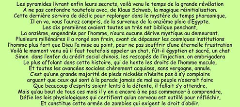 Une autre minorité, numériquement plus importante, néanmoins, comprend instinctivement que l’on veut pousser le troupeau vers le précipice et tente de se raccrocher à quelques lueurs de compréhension, mais sans être encore capable d’analyse rationnelle : c’est la mouvance résistante aujourd’hui qualifiée de « complotiste » !
